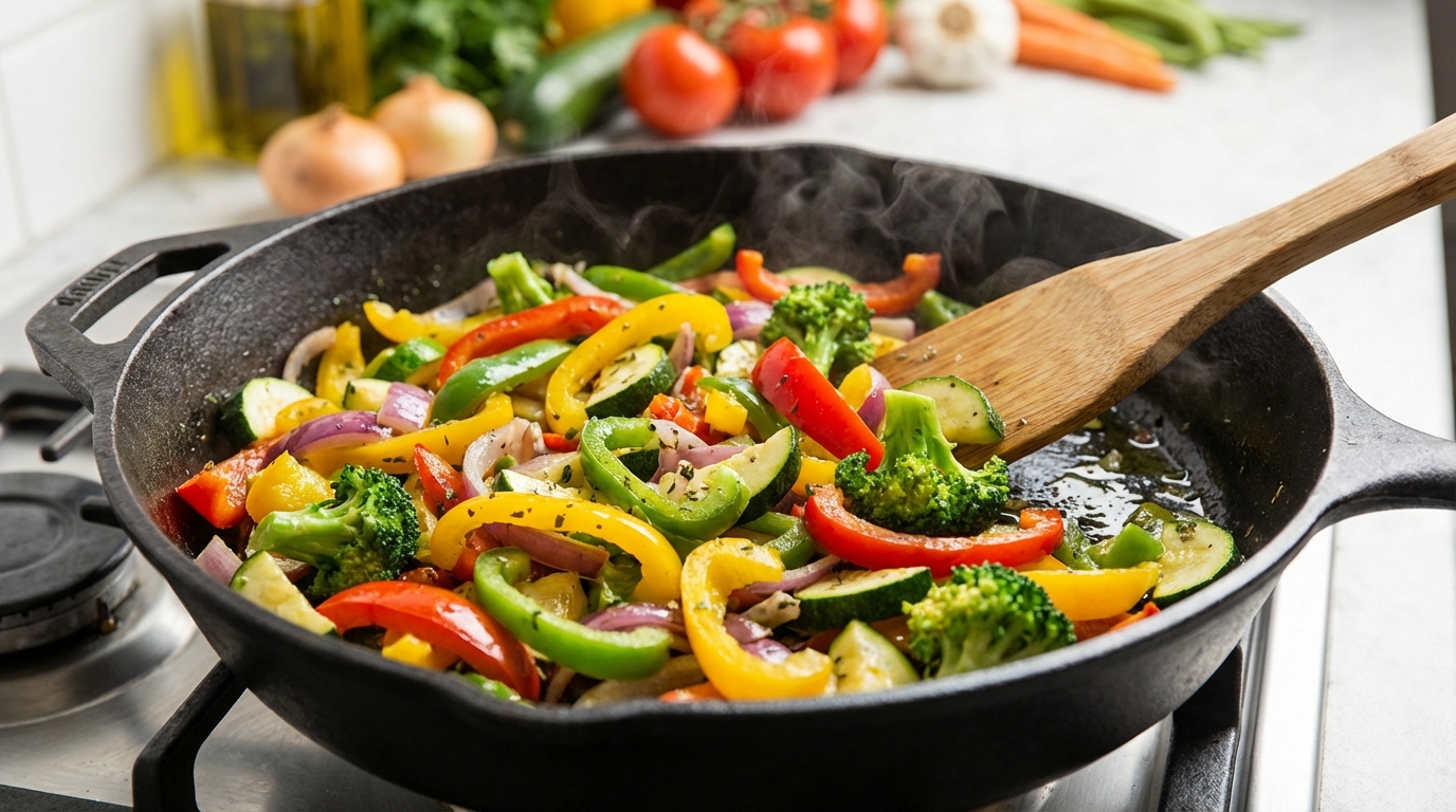 Ajoute une cuillère à café d’eau si besoin pour éviter qu’ils accrochent. Les légumes doivent rester légèrement croquants pour apporter fibres et volume.