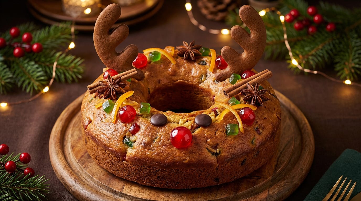 - L’essentiel à retenir : cette recette festive marie une couronne moelleuse aux épices et fruits confits à un décor de renne créatif.