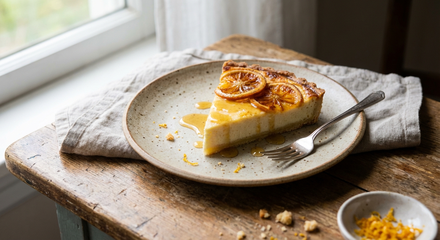 Une fois la tarte cuite, le repos fait toute la différence. La texture se pose, les arômes de citron et de fleur d’oranger se fondent dans le crémeux de la brousse.