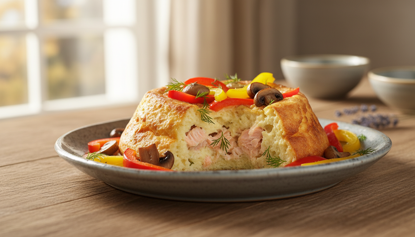 Clafoutis aérien au saumon, rehaussé de poivrons croquants et champignons savoureux