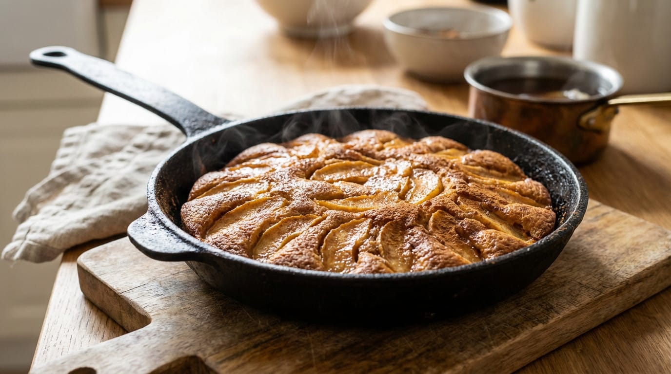 Le démoulage : l’étape finale pour un visuel parfait Coupez le feu une fois la cuisson terminée. Glissez une spatule souple sur tout le pourtour pour vérifier l’adhérence. Rien ne doit accrocher aux parois. Posez une grande assiette plate directement sur la poêle chaude. Saisissez fermement le manche et l’assiette ensemble avec des maniques adaptées. Retournez l’ensemble d’un geste rapide et confiant sans hésiter. La gravité fera le reste du travail pour vous. Vous obtenez un superbe gâteau pommes cannelle poele aux fruits parfaitement caramélisés. Servez-le encore tiède pour profiter de toutes ses saveurs rustiques. Les astuces de chef pour réussir votre gâteau à coup sûr La technique est simple, mais quelques détails peuvent tout changer. Voici mes conseils pour ne jamais rater votre gâteau à la poêle. Le choix de la poêle : votre meilleure alliée Optez impérativement pour une poêle en fonte ou à fond épais. Ce matériel garantit une diffusion lente et homogène de la chaleur, ce qui évite de brûler le caramel et les pommes avant la cuisson du cœur. Une bonne poêle antiadhésive fait aussi l’affaire, à condition d’avoir un couvercle adapté. L’étanchéité est non négociable : le couvercle doit être bien hermétique pour emprisonner la vapeur nécessaire à la cuisson. Fuyez les poêles à fond fin. Elles créent des points chauds instantanés et carboniseront le dessous de votre gâteau. Maîtriser la chaleur : le point qui fait la différence Gaz, induction ou électrique, chaque cuisinière a ses caprices et le « feu minimum » varie énormément. L’objectif reste le même : obtenir une chaleur très douce et surtout constante tout au long de la cuisson. Voici mon secret : le diffuseur de chaleur. C’est un accessoire bon marché qui s’intercale entre le feu et la poêle. Il sauve la mise si vos brûleurs à gaz sont trop puissants, même au minimum. Cette méthode de cuisson douce n’est pas réservée aux pommes. C’est aussi la clé pour réussir un gâteau au yaourt poêlé, qui repose exactement sur le même principe thermique. Au-delà de la recette : histoire et accompagnements La technique est maîtrisée, mais ce gâteau possède aussi une âme qu’il faut comprendre pour mieux l’apprécier. Un gâteau rustique hérité des pionniers Ce gâteau n’est pas une invention moderne. C’était une pure cuisine de nécessité pour les pionniers américains du XIXe siècle. Sans four à disposition, leur poêle en fonte devenait l’ustensile à tout faire. C’est l’histoire d’une survie gourmande. Aujourd’hui, on revient à cette méthode ancestrale par choix. Elle s’impose comme une solution pratique et ingénieuse pour quiconque manque de four. C’est la pâtisserie simplifiée à l’extrême, sans sacrifier le goût. Les meilleurs accords pour sublimer votre gâteau L’expérience ne s’arrête pas à la cuisson. Il faut des accompagnements qui renforcent ces saveurs pommes-cannelle réconfortantes. On cherche ici à recréer la nostalgie d’un goûter d’enfance parfait.