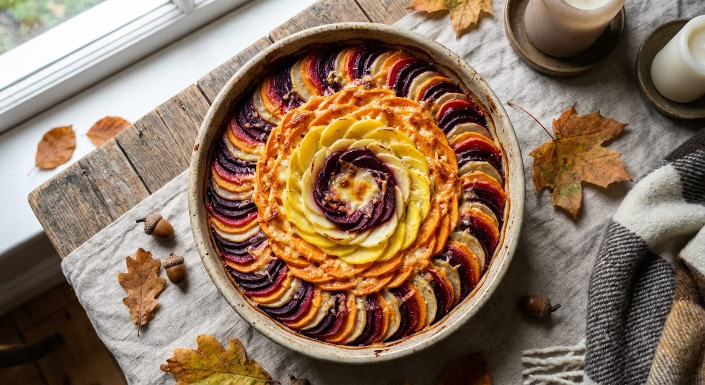 Un gratin irrésistible : pommes de terre, patates douces et betteraves s’accordent pour fondre en bouche