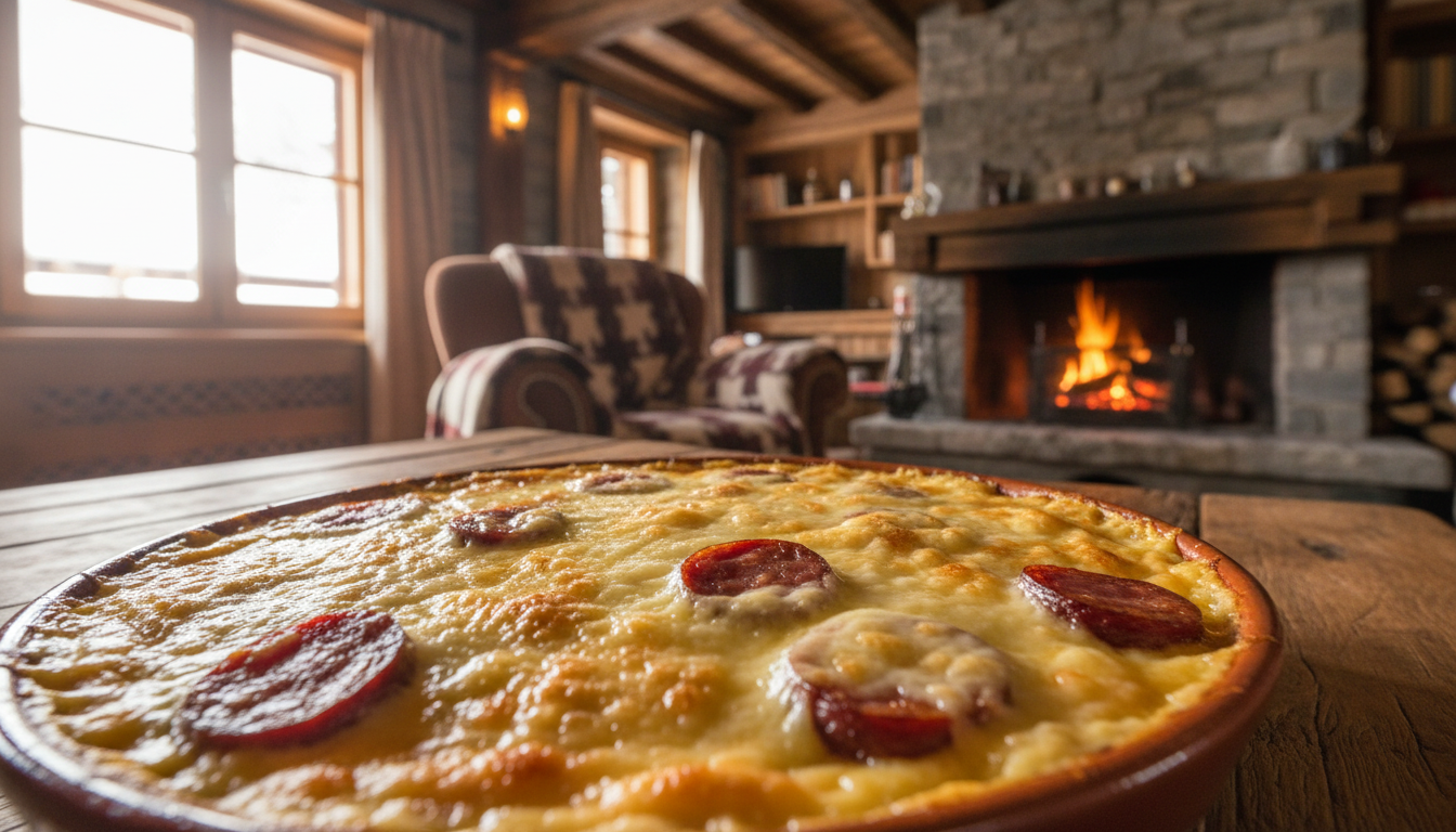 Plongez dans l’atmosphère chaleureuse d’un chalet savoyard avec ce gratin fondant au reblochon et à la saucisse de Morteau fumée