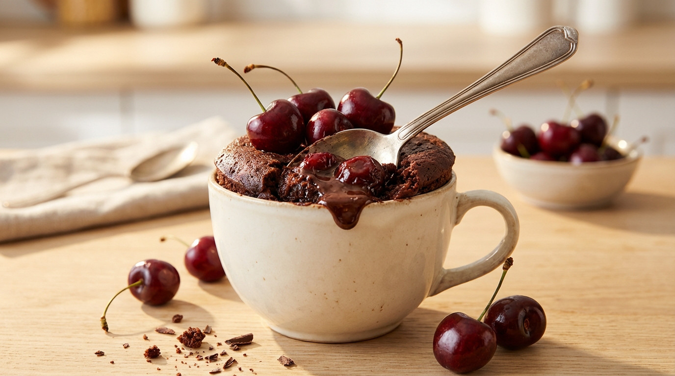 Mug cake chocolat cerise : recette légère prête en 2 min