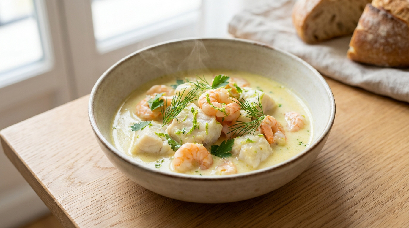 Le secret du chef et la petite histoire Voici le détail qui fait souvent la différence. Faites revenir vos champignons égouttés dans un filet d’huile d’olive avant de les mélanger à la sauce. Cette alternative légère change vraiment tout. Cette blanquette de la mer est une adaptation moderne apparue dans les années 70. Elle s’affranchit du traditionnel rôle du beurre en cuisine française pour plus de légèreté. C’est l’option parfaite pour éviter le lactose. Cette recette de blanquette marine revisite un grand classique avec légèreté. La sauce onctueuse à la coco sublime parfaitement les poissons et crevettes. C’est le plat idéal pour un dîner rapide mais raffiné. Servez aussitôt pour profiter de toutes les saveurs. À table FAQ Quels ingrédients se marient avec le lait de coco ? Le lait de coco sublime les produits de la mer. Il s’accorde parfaitement avec le saumon, le cabillaud et les crevettes. C’est une base idéale pour une sauce onctueuse. Côté végétal, il aime les carottes et les oignons. L’ajout d’épices douces ou d’herbes comme l’aneth crée un équilibre savoureux. C’est l’allié d’une cuisine légère. Quel vin blanc servir avec une blanquette de la mer ? Privilégiez un vin blanc sec et minéral. Un Chablis de Bourgogne ou un Sancerre de la Loire sont parfaits. Ils tranchent avec la rondeur de la sauce coco. Servez le vin frais, entre 10 et 12°C. Évitez les vins trop boisés ou sucrés. L’objectif est de respecter la délicatesse du poisson. Peut-on remplacer la crème fraîche par du lait de coco ? Oui, c’est une excellente alternative pour alléger le plat. La crème de coco apporte une texture veloutée similaire à la crème classique. Elle donne une note originale sans dominer. Cette substitution rend la recette digeste et sans lactose. C’est une astuce simple pour moderniser ce grand classique. Le résultat est tout aussi gourmand. Est-il possible de préparer la blanquette la veille ? Vous pouvez préparer la base de sauce et les légumes à l’avance. Les saveurs auront le temps de se développer. Conservez le tout au frais dans un récipient hermétique. Attention toutefois à la cuisson du poisson. Ajoutez les morceaux de poisson seulement au moment du réchauffage. Cela évite qu’ils ne deviennent secs ou ne s’émiettent. Que signifie exactement le mot « blanquette » ? Ce terme culinaire fait référence à la couleur blanche de la sauce. Elle nappe les ingrédients cuits dans un bouillon. C’est un emblème de la cuisine française traditionnelle. Ici, la recette est revisitée en version marine. On garde le principe de la sauce blanche liée. Mais on change les ingrédients pour plus de légèreté.