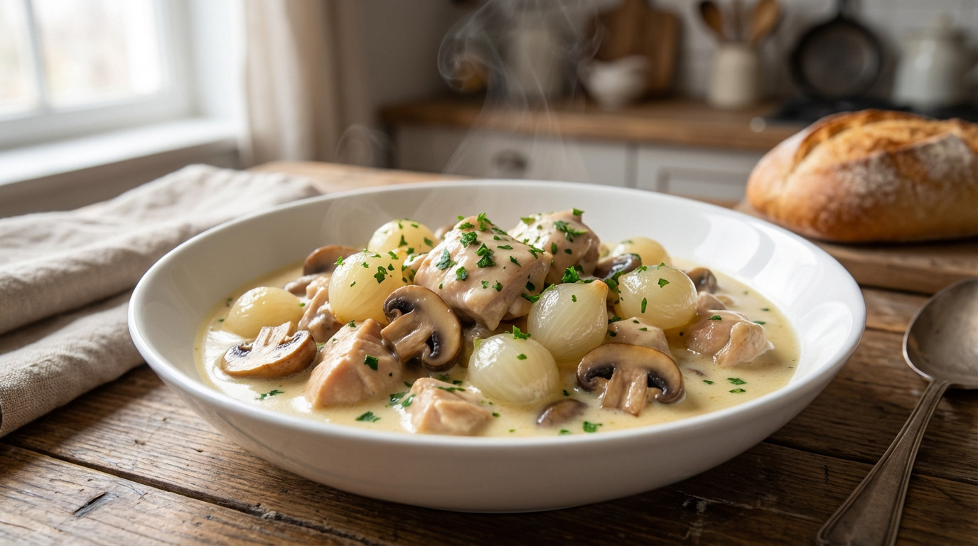 Choisir la bonne volaille : des hauts de cuisse pour un maximum de fondant. C’est le même secret que pour une dinde rôtie farce marrons réussie. Maîtriser la température : ne jamais faire bouillir la sauce après l’ajout de la liaison crème-œuf. Personnaliser le goût : une pincée de noix de muscade ou un zeste de citron dans la sauce finale apporte un vrai plus.