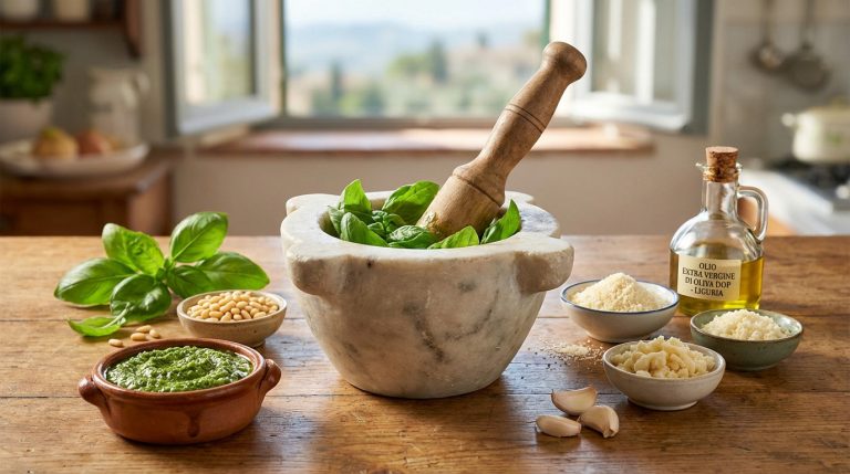 Réussir le vrai pesto genovese exige des ingrédients AOP et un mortier. Respectez l’ordre des étapes pour obtenir une émulsion parfaite.