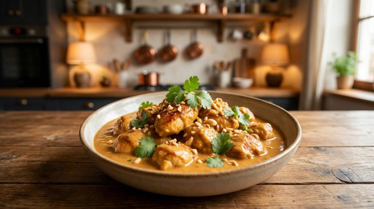 Pour aller à l’essentiel : le secret d’une sauce inratable réside dans l’utilisation d’un beurre de cacahuètes 100 % naturel mélangé au lait de coco entier. Cette base offre une texture crémeuse immédiate en évitant les ébullitions fortes. Avec une préparation totale de 35 minutes, ce plat économique garantit un équilibre nutritionnel idéal et une viande tendre grâce à un mijotage court.