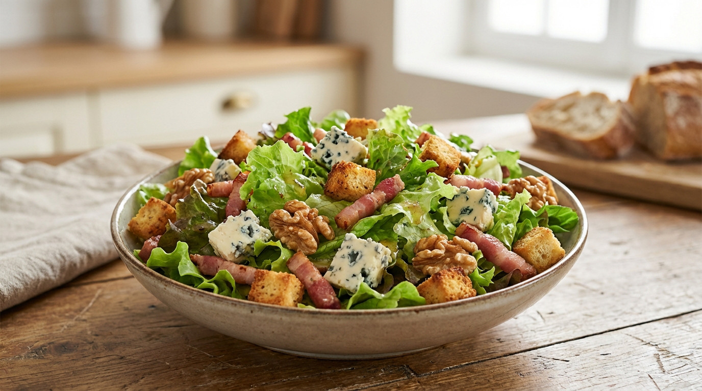 La recette est simple. Mais quelques détails transforment ce plat en une expérience mémorable. La Bresse, un terroir de caractère La Bresse s’étend entre l’Auvergne-Rhône-Alpes et la Bourgogne-Franche-Comté. C’est une terre de traditions agricoles. Elle est mondialement célèbre pour sa volaille de Bresse (AOC), la seule à posséder cette appellation d’excellence. Le Bleu de Bresse est plus récent. Créé après la guerre, ce fromage séduit par sa texture fondante unique. Son goût persillé reste subtil. C’est l’ingrédient clé qui apporte du caractère sans écraser les autres saveurs de cette recette. L’astuce pour une salade toujours croquante Une salade frisée mouillée gâche tout. L’eau empêche la vinaigrette d’adhérer aux feuilles. Il faut la sécher méticuleusement pour préserver le croquant. L’essoreuse reste l’outil le plus efficace pour garantir ce résultat. Pas d’essoreuse ? Voici une technique de chef. Placez les feuilles lavées dans un torchon propre. Formez un baluchon serré. Sortez et faites-le tournoyer énergiquement à bout de bras. La force centrifuge expulse toute l’eau restante. L’art de servir et d’accompagner Quel vin pour accompagner votre salade ? Le choix du vin est capital pour dompter la puissance du fromage. Il doit aussi équilibrer le côté salé des lardons.