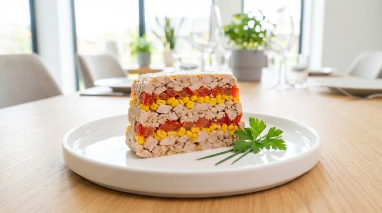 Pour aller à l’essentiel : la réussite de cette terrine de dinde légère réside dans l’égouttage méticuleux du maïs et des tomates. Cette étape clé, associée à une cuisson douce au bain-marie, assure une texture ferme mais moelleuse sans excès d’humidité. Le secret final pour une découpe nette reste le repos obligatoire de 4 heures au réfrigérateur.