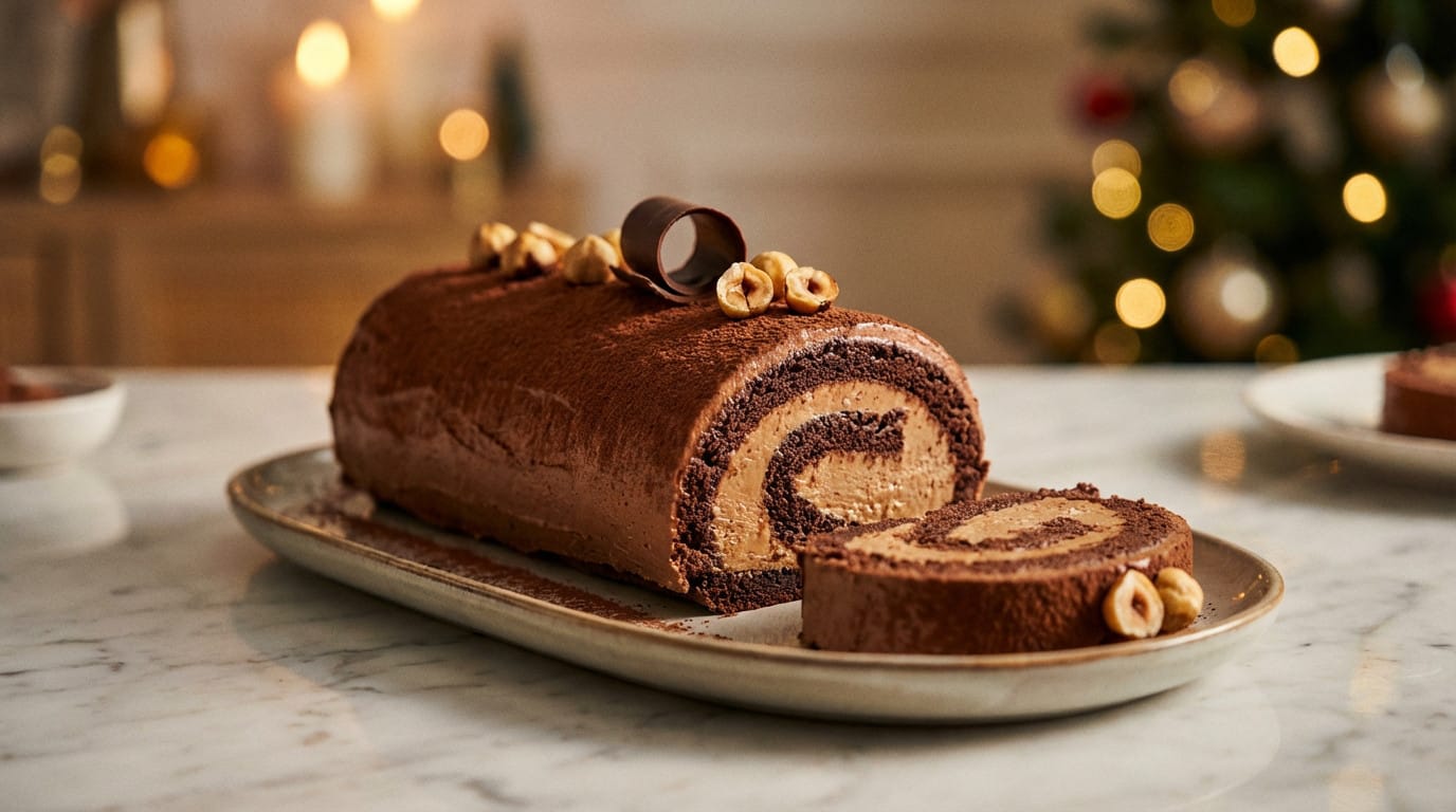 Sachez que tout comme pour des brownies ultra moelleux, l’humidité est la clé. Le temps de repos : pourquoi il ne faut pas le zapper Placez la bûche serrée au réfrigérateur pour au moins 2 heures, ou 30 minutes au congélateur si vous êtes pressé. Cette étape est fondamentale. Elle permet à la bûche chocolat praliné de se raffermir et aux saveurs de se mélanger. C’est la garantie d’une découpe nette. La touche finale : une décoration simple mais qui en jette Votre bûche est montée, elle est bien froide. Il ne reste plus qu’à la rendre aussi belle que bonne, et pour ça, pas besoin d’être un artiste. Recouvrir la bûche avec le reste de ganache Déballer la bûche et la poser sur son plat de service. Couper les deux extrémités en biseau pour un rendu plus net. Utiliser le reste de ganache montée pour masquer les imperfections. On peut l’étaler à la spatule pour un effet lisse ou texturé. On peut aussi utiliser une poche à douille pour un décor plus travaillé, mais toujours simple. Créer un effet « bois » avec une fourchette Une fois la bûche recouverte de ganache, prendre une simple fourchette. La passer sur toute la longueur pour créer des stries qui imitent l’écorce. C’est une technique de grand-mère qui fait toujours son effet. Elle a l’avantage de masquer les petits défauts de lissage. En pâtisserie, surtout pour les fêtes, l’élégance se cache souvent dans la simplicité. Un coup de fourchette bien placé vaut parfois mieux qu’un glaçage miroir. Quelques idées de déco gourmandes et rapides Parsemer la bûche de noisettes concassées et torréfiées. Cela ajoute du croquant et rappelle le goût du praliné. On peut aussi faire couler un filet de praliné pur sur le dessus ou saupoudrer légèrement de cacao en poudre non sucré. Quelques copeaux de chocolat finiront le travail. C’est simple, rapide, et toujours délicieux, un peu comme on le ferait pour des cookies américains aux pépites de chocolat, la qualité du chocolat fait toute la différence. Astuces anti-échec et conservation de votre bûche Mon biscuit a cassé, comment le sauver ? Pas de panique si une vilaine fissure apparaît soudainement sur le biscuit. Continuez simplement de rouler le biscuit sans hésiter. La garniture et le serrage agiront comme une colle efficace. Une fois la bûche roulée, la ganache extérieure masquera tout défaut visuel. Personne ne verra la différence lors de la dégustation finale. Ne jetez surtout pas l’éponge, car un biscuit fissuré reste un dessert délicieux. C’est le principe même d’une recette simplifiée. Préparer sa bûche à l’avance : le guide pratique Vous pouvez monter la bûche roulée, mais non décorée, jusqu’à 2 jours à l’avance sans aucun risque. Conservez-la bien filmée hermétiquement au réfrigérateur pour la protéger. Les saveurs n’en seront que meilleures. La décoration finale se fait le jour même ou la veille au soir. Cela évite que la ganache ne sèche en surface. Vos décors ne ramollissent pas non plus au contact de l’humidité. Conservation et dégustation : les secrets d’une bûche parfaite le jour j Une fois décorée, la bûche se conserve au réfrigérateur jusqu’au moment du dessert. Sortez-la environ 20 minutes avant de la servir à vos invités. La ganache retrouve ainsi toute son onctuosité et ses arômes subtils. Pour une découpe parfaite, prenez une lame de couteau longue et fine. Trempez-la dans l’eau chaude et essuyez entre chaque part.