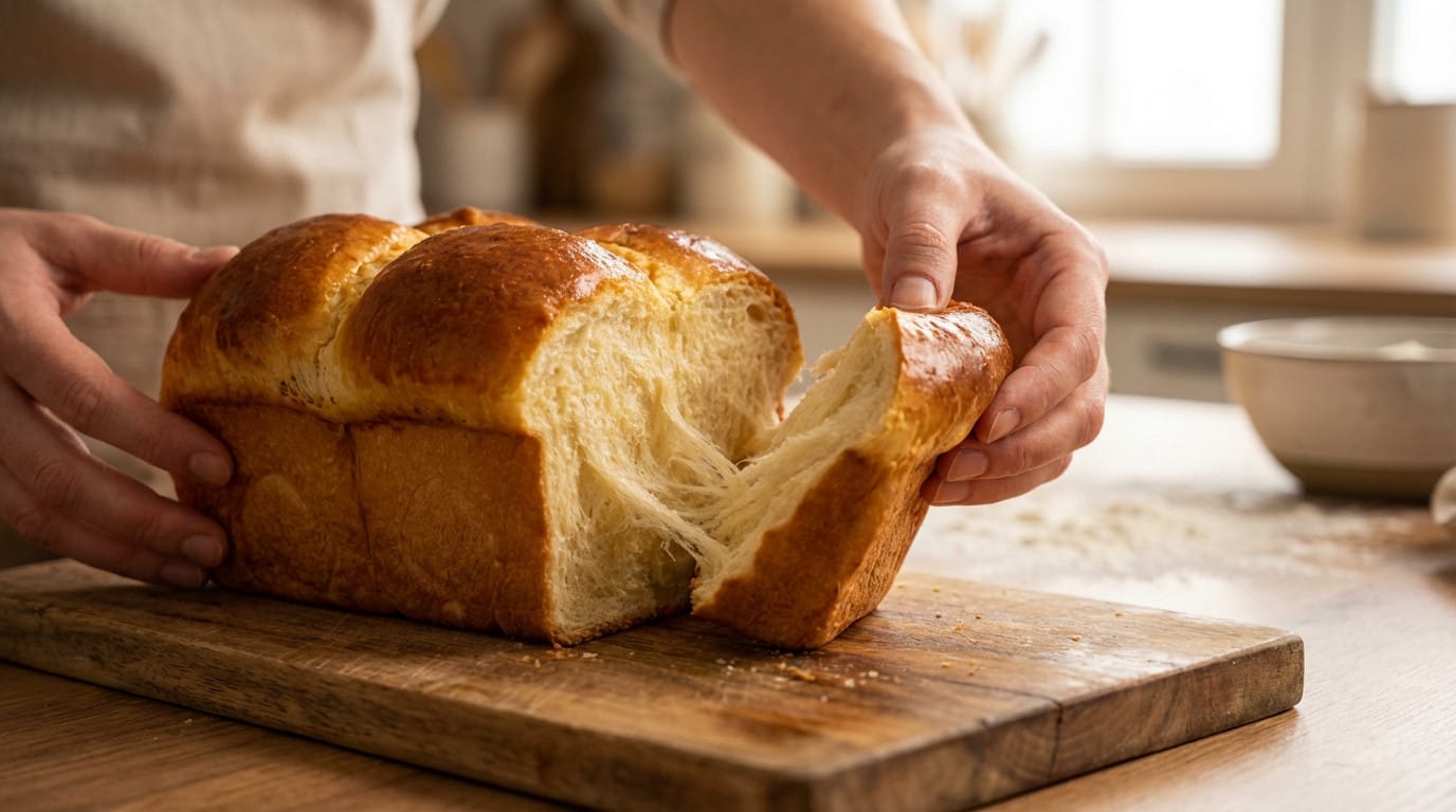 Maintenant que tout est prêt, on passe au cœur du sujet : le pétrissage. C’est ici que se joue la réussite de votre mie moelleuse et filante. Lancer la machine : le frasage et le développement du gluten Formez un puits avec la farine dans la cuve du robot. Placez le sel et le sucre d’un côté, la levure à l’opposé pour éviter le contact. Séparez-les bien, car le sel tue la levure et gâche tout. Mélangez l’eau tiède avec le lait et les œufs en poudre dans un bol à part. Versez ce liquide au centre, directement sur la levure. Lancez le frasage à vitesse lente pendant 5 minutes pour mélanger. Accélérez ensuite la cadence durant 10 minutes pour construire un solide réseau de gluten. L’incorporation du beurre : le secret d’une pâte brillante et élastique Incorporez progressivement le beurre clarifié froid coupé en morceaux. La pâte va se déstructurer et devenir affreusement collante. C’est une étape normale, ne paniquez surtout pas. Persévérez avec le pétrissage à vitesse moyenne pendant 10 à 15 minutes. La pâte finira par claquer et se décoller des parois. Elle doit devenir lisse et brillante. Réalisez le fameux test de la membrane pour valider votre travail. Si la pâte s’étire très finement sans se déchirer, c’est gagné. La patience récompensée : les temps de pousse et le façonnage Votre pâte est maintenant parfaite. Mais le travail n’est pas fini, il faut maintenant lui laisser le temps de vivre sa vie. La patience est l’ingrédient secret. La première pousse (pointage) : laissez la magie opérer Formez une boule régulière avec votre pâte. Placez-la ensuite dans un grand saladier légèrement huilé pour éviter qu’elle ne colle aux parois. Couvrez le récipient d’un film ou d’un torchon humide. Laissez reposer au chaud, vers 25°C, pendant 1h30 à 2h. La pâte doit impérativement doubler de volume pour réussir. Dégazer et façonner : la technique de la brioche de Nanterre Renversez la pâte sur un plan de travail un peu fariné pour le dégazage. Appuyez doucement avec la paume pour chasser l’air, sans brutaliser la matière. Divisez la pâte en trois pâtons de poids égal. Boulez-les et calez-les côte à côte dans le moule beurré. Cette base sert aussi pour un saucisson brioché moelleux. La dernière ligne droite : l’apprêt avant la dorure Couvrez le moule et laissez pousser encore 1h à 1h30 dans un lieu tiède. C’est le moment où la mie devient filante. Les boules doivent gonfler jusqu’à se souder complètement. Préchauffez alors votre four à 180°C. Badigeonnez la surface de lait et ajoutez le sucre perlé. Cuisson, astuces et dégustation : le final gourmand La cuisson parfaite et l’astuce du chef Enfournez à mi-hauteur pour 25 à 30 minutes à 180°C. Si le dessus brunit trop vite, couvrez d’aluminium. La lame d’un couteau plantée au cœur doit ressortir sèche, preuve que la cuisson est aboutie. Voici le secret des pros : le « coup de buée ». La vapeur créée dans le four garantit une mie aérienne et une croûte fine. C’est ce détail qui change tout pour la texture. Comment savourer votre brioche maison ? Une telle réussite se suffit à elle-même, c’est certain. Mais pour les gourmands, voici quelques idées pour sublimer l’instant.